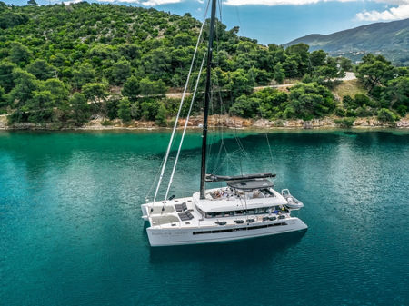 DUOLIFE has five queen size beds, all ensuite, luxurious, well-designed cabins with side access to beds. A black window frame, a black mast, a boom, an additional roof on the second deck and grey sideboards add unique character to this catamaran. Fully equipped with attractive sun lounge on the upper deck for sunbathing in the sun or shade. The super-wide stern with two accompanying ladders and a hydraulic platform lets you enter, leave and jump into the water quickly and easily or perhaps just catch some sun close to the sea.