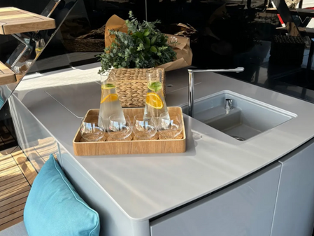 On the flybridge, the SHADES OF GREY has another large dining table, perfect for up to 10 guests, with a U-shaped seating area. Behind this is a full width sunbathing area. Forward of the helm position is an attractive bar, where you can enjoy a drink or have a snack from the chef.