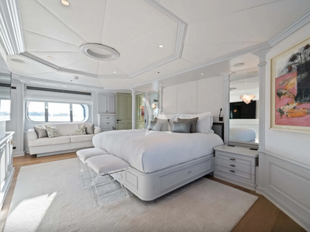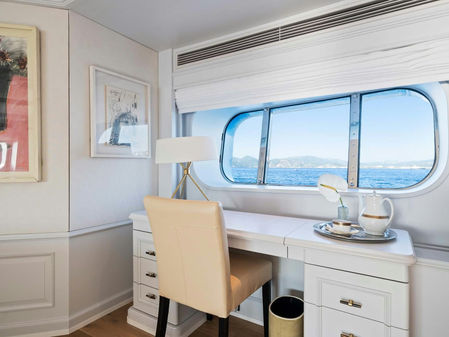 Accommodation is spacious and serene, led by a stunning full-beam master suite on the main deck. This private haven includes a dedicated lounge and an ensuite bathroom finished in onyx and marble. Five additional guest cabins are equally well-appointed, and an AV system ensures access to entertainment throughout the yacht.