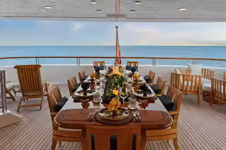 Amica Mea is built with a steel hull and aluminium superstructure. Powered by twin Caterpillar engines, she comfortably cruises at 12 knots, reaches a maximum speed of 14 knots with a range of up to 4,500 nautical miles from her 92,000 litre fuel tanks at 10 knots. Amica Mea features at-anchor stabilizers providing exceptional comfort levels.