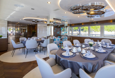 Guests can savor Mediterranean specialties by their Chef in the interior or sundeck dining area. The interior dining lounge on the upper deck features two tables seating ten persons each, as well as cozy lounging sets ideal for aperitifs while taking in the mesmerizing views through panoramic windows. The onboard dining experience is a culinary journey, with the Chef using the fresh produce from Anthea's private organic garden to create exquisite dishes that will tantalize your taste buds.